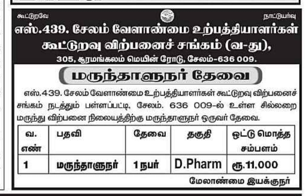 எஸ்.439 சேலம் வேளாண்மை உற்பத்தியாளர்கள் கூட்டுறவு விற்பனை சங்கம்  நடத்தும் பள்ளப்பட்டி  சேலம் -636 009-இல் உள்ள சில்லறை மருந்து விற்பனை நிலையத்திற்கு  மருந்தாளுநர் ஒருவர் தேவை.