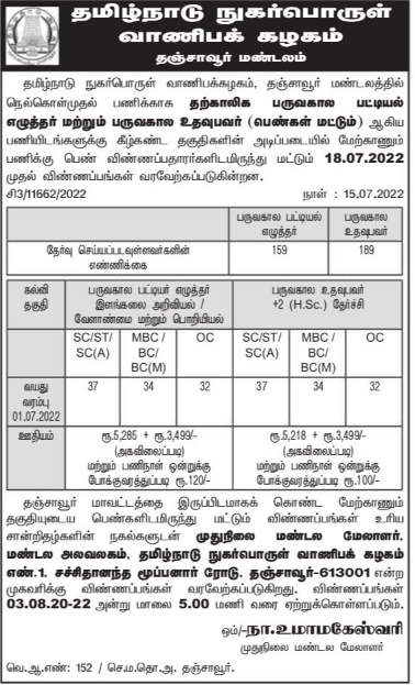 தமிழ்நாடு நுகர்பொருள் வாணிபக் கழகம் தஞ்சாவூர் மண்டலத்தில் கொள்முதல் பணிக்காக பருவகால பட்டியல் எழுத்தர் 159, உதவுபவர்-189 பணியிடங்களுக்கு கீழ்கண்ட தகுதிகளின் அடிப்படையில் மேற்காணும் பணிக்கு தகுதியான பெண் விண்ணப்பதாரர்களிடம் விண்ணப்பங்கள் வரவேற்கப்படுகின்றன.
